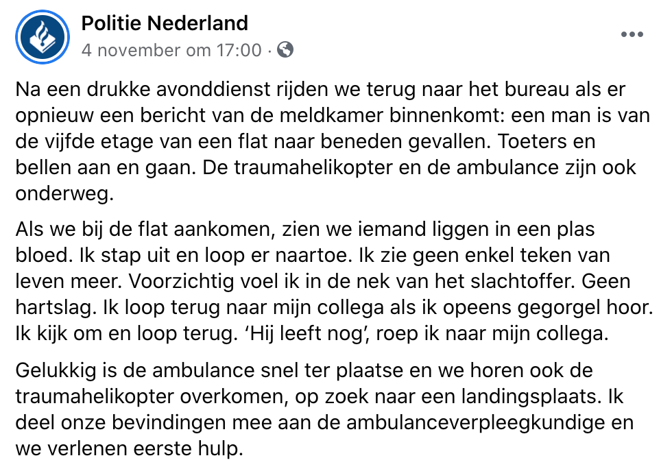 Als politieagent heb je regelmatig te maken met heftige incidenten. In veel gevallen wordt er bij een dergelijk incident het nodige onderzoek gedaan. Rechercheurs zitten er bovenop. Soms lijken gebeurtenissen een hele bijzondere aanleiding te hebben. Zo ook dit verhaal dat gedeeld wordt door Politie Nederland.