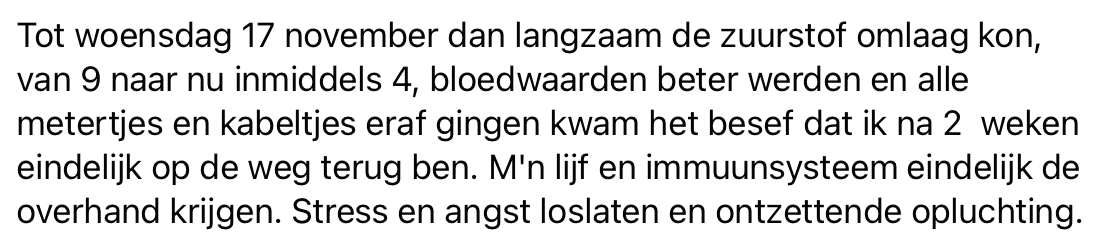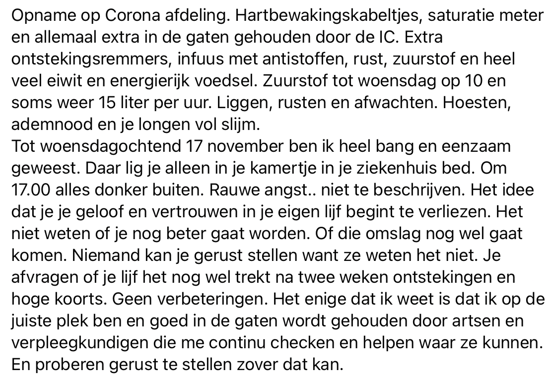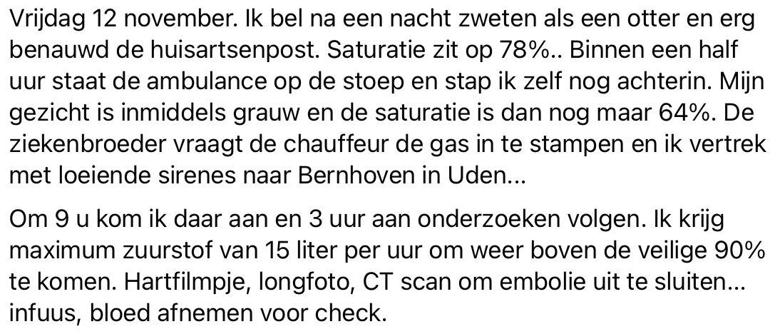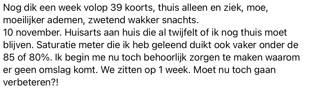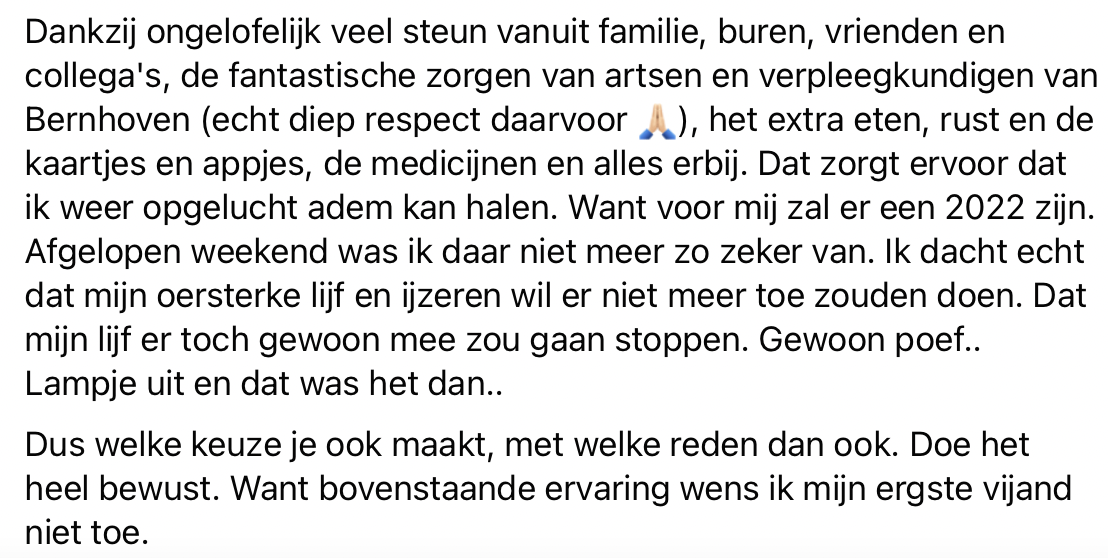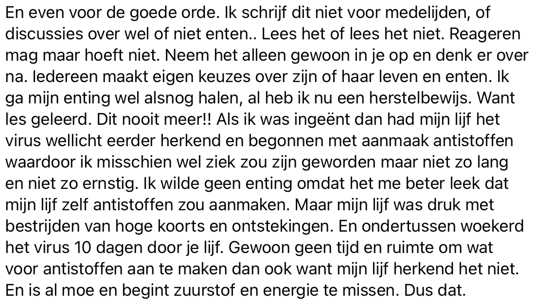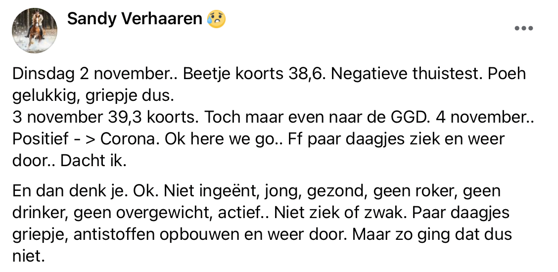Sandy is een jonge gezonde vrouw. Ze besluit om zich niet te laten vaccineren, ze vertrouwt er op dat haar lichaam zelf antistoffen zal aanmaken. Maar op dinsdag 2 november gaat het mis. Eerst lijkt het een griepje te zijn, maar twee dagen later blijkt het toch corona te zijn. Ze maakt een hele zware en heftige twee weken mee. Sandy vertelt haar verhaal op Facebook, omdat ze wil meegeven dat je zelf moet weten welke keuze je maakt, maar dat je dat heel bewust doet. De ervaring die ze zelf heeft meegemaakt wenst ze echt helemaal niemand toe.