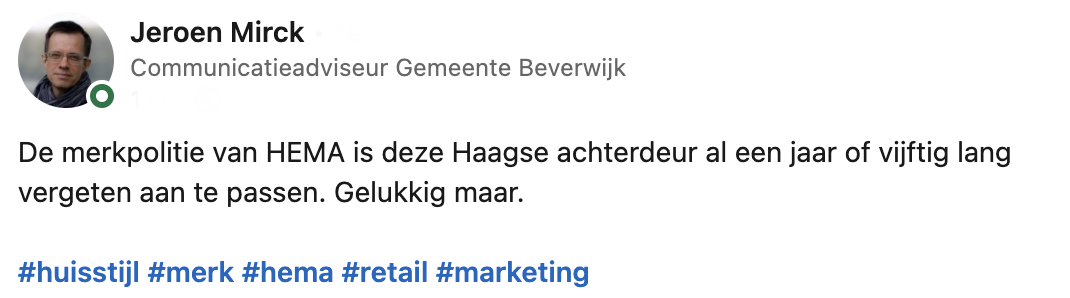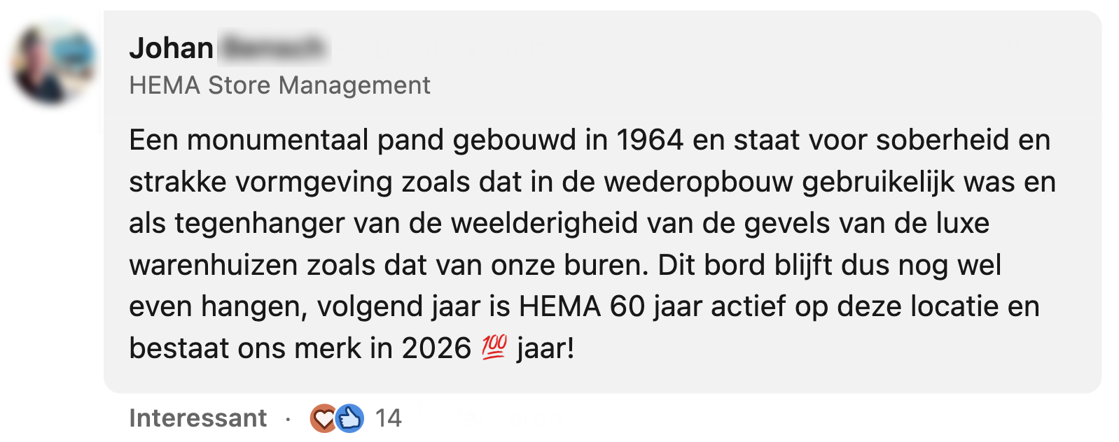 Het logo van HEMA is heel simpel: een rood vlak waarin met witte koeienletters de naam van de winkel staat. Kan niet missen, toch? Jeroen keek daarom nogal raar op toen hij langs een filiaal liep en ineens een totaal ander logo op een bord zag staan. Hij deelt zijn ontdekking op LinkedIn en krijgt daar een hoop verbaasde reacties én een verklaring voor terug.