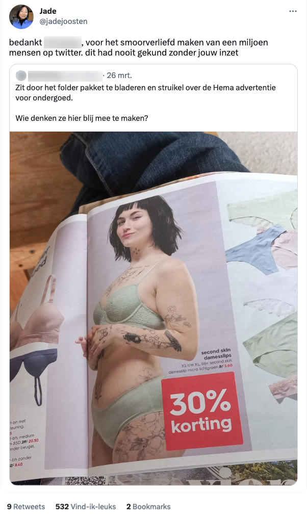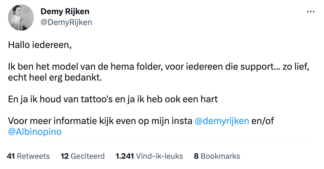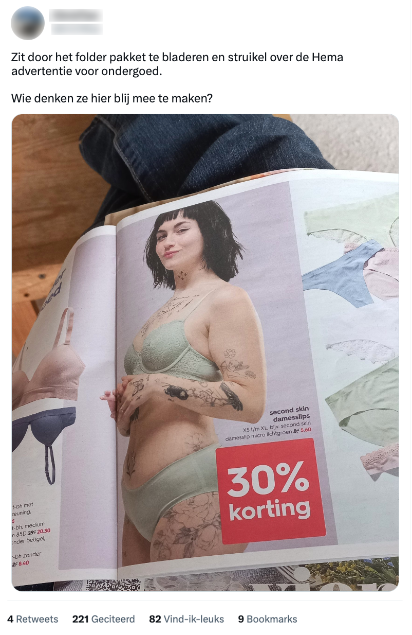 Diversiteit en inclusiviteit spelen een belangrijke rol in onze samenleving. Gelukkig, zie je dit ook steeds meer terug in de reclame-uitingen van bedrijven. Modellen zijn er in alle soorten en maten en het maakt niet uit hoe iemand eruit ziet. Stap voor stap wordt het mode-beeld daardoor een stuk realistischer. Toch blijkt uit onderstaande tweet, waarin kritiek wordt geuit op een model uit de HEMA-folder, dat er nog genoeg mensen zijn die aan zo’n realistisch beeld moeten ‘wennen’…
