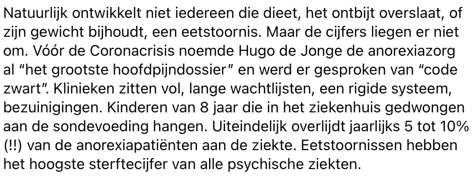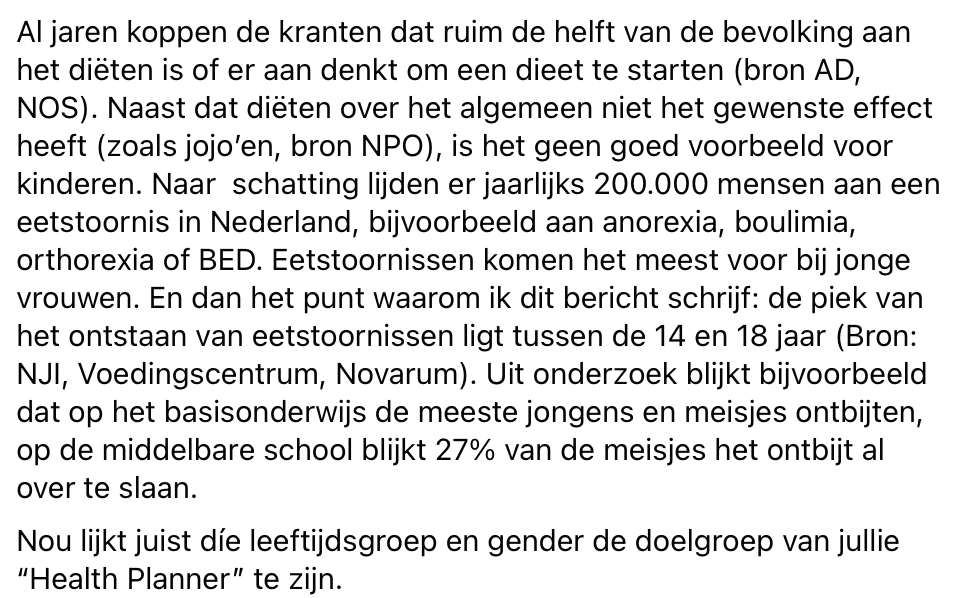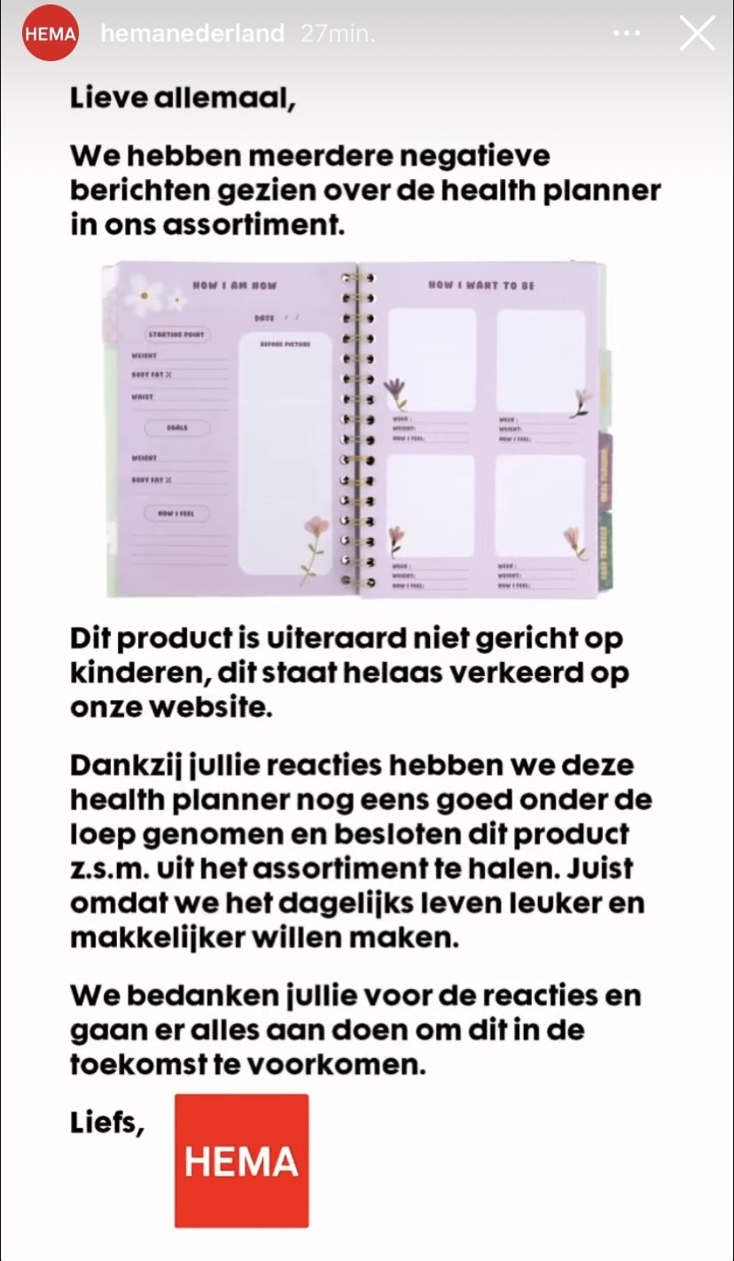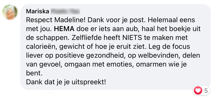 Door sociale media is iedereen heel erg gefocust op ‘het perfecte plaatje’. Online zien we vaak gespierde en fitte lichamen, waardoor sommigen het idee hebben dat ook zij er zo uit zouden moeten zien. Niets is natuurlijk minder waar, want iedereen is prachtig op een eigen manier. Daarom vond Madelinde een product van HEMA problematisch. De winkel blijkt een boekje te verkopen die, aan het design te zien, gericht is op jongeren. In dit boekje kan je precies bijhouden hoeveel calorieën je eet en hoeveel je al bent afgevallen. Volgens Madelinde is dit absoluut niet de juiste benadering en kan het onzekere mensen alleen maar onzekerder maken. Daarom besluit ze  zich tot HEMA te richten.