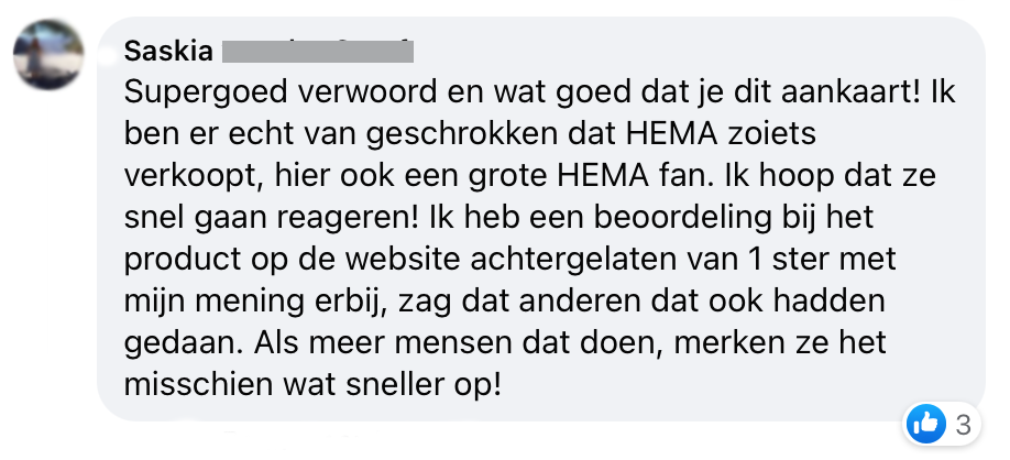 8. Saskia geeft aan dat ze het product op de website een slechte beoordeling heeft gegeven, zodat dit bericht hopelijk zo snel mogelijk HEMA bereikt.