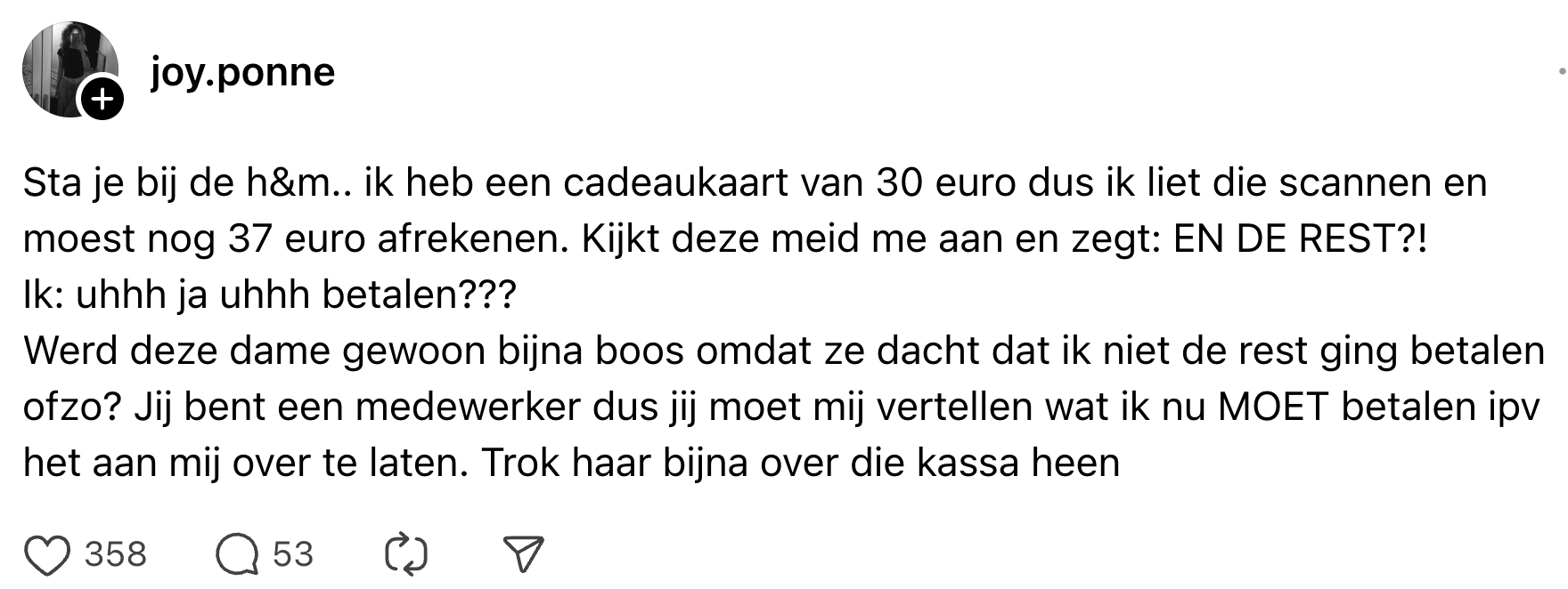 Als je een kledingwinkel binnenloopt, is het fijn zijn om goed geholpen te worden. Nou hoeven medewerkers echt niet meteen de rode loper voor je uit te rollen, maar je verwacht wel een klein beetje service. Joy staat daarom met haar mond vol tanden als ze met een cadeaukaart wil afrekenen bij H&M, maar een nogal opmerkelijke reactie krijgt van de medewerker achter de toonbank.
