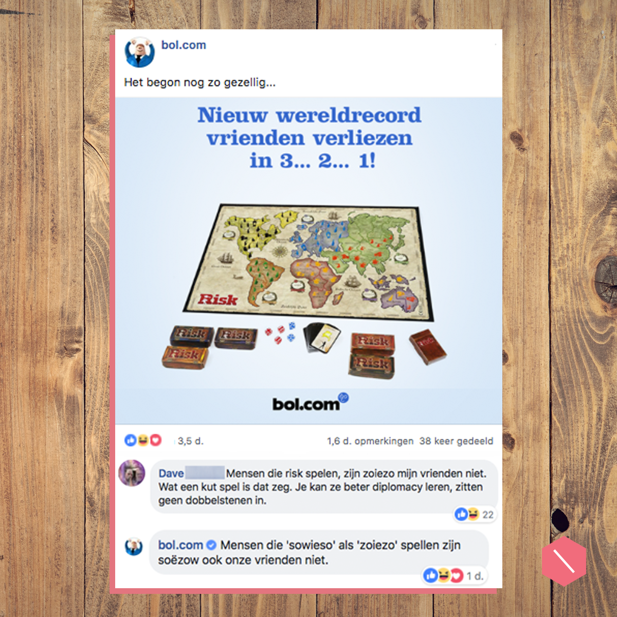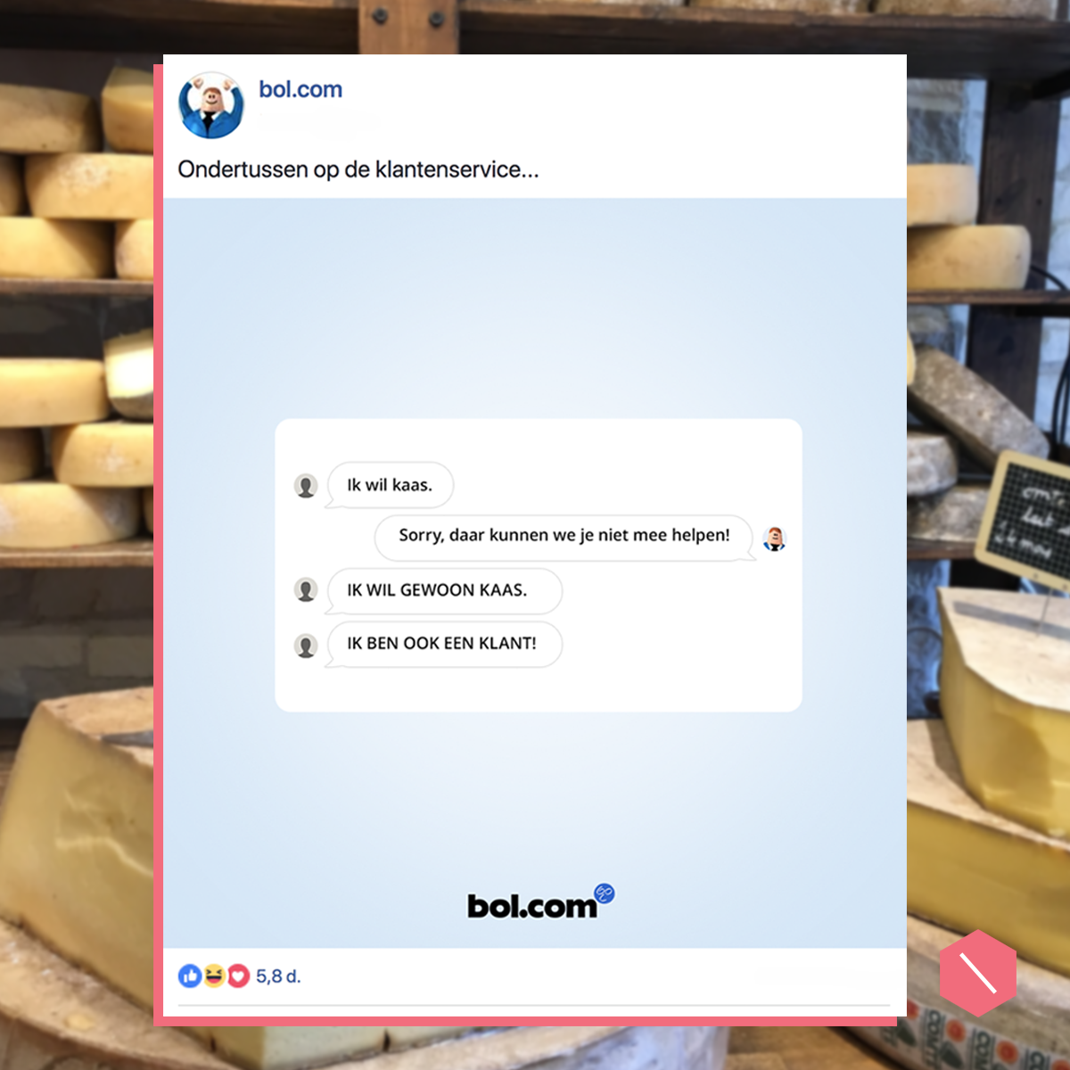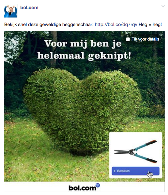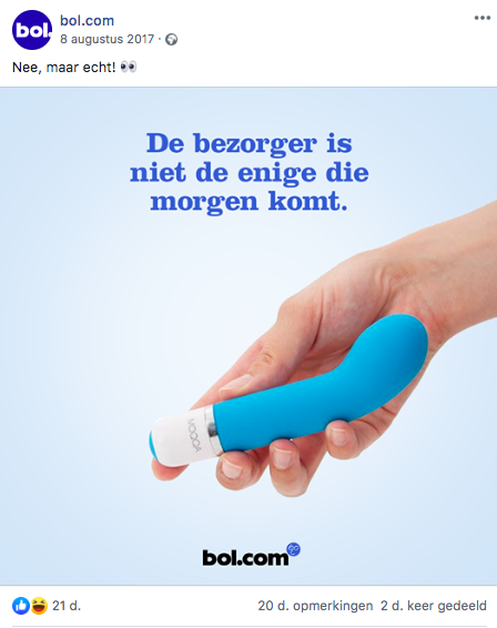 6. 2017 was het jaar van de eerste viral hit. Al kwam bol.com er na publicatie pas achter dat ‘ie niet door Facebook als advertentie werd getoond door de inhoud. Hij ging organisch ook door het dak en won The Best Social Award voor ‘Beste Copywriting’.