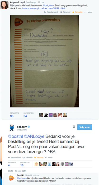1. Bol.com zag in 1999 het levenslicht als online boekhandel. In 2014 waren ze al bijdehand op Twitter. (Op de brief staat: “bestel geen dingen bij bol.com als het niet door de bus past, ik word doodmoe van alle online bestellingen die niet passen”.)