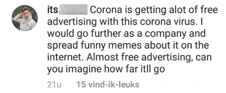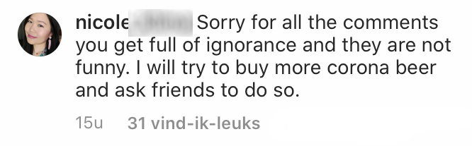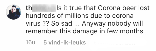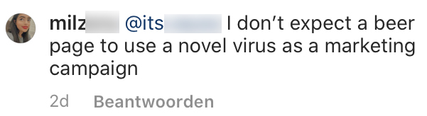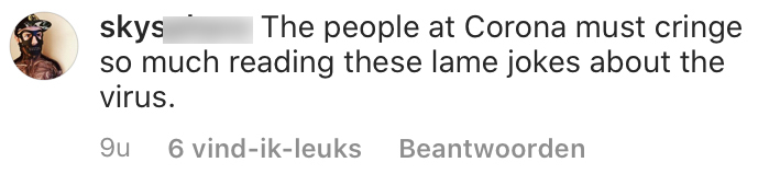 Toen de eerste berichten over het coronavirus kwamen, legde iedereen al snel de link met het biertje. Helaas is die connectie nog niet helemaal verdwenen. Op Instagram worden ze dan ook constant bestookt met comments over het coronavirus, maar het biermerk laat zich niet kisten.