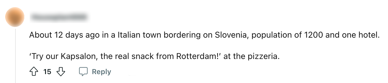 De Hollandse keuken kan misschien (nét) niet tippen aan de Italiaanse keuken. Op het gebied van snacks daarentegen behoren we – al zeggen we het zelf – toch wel tot de top. Een vette kapsalon mét een extra klodder knoflooksaus: heurlijk. Zélfs ver buiten onze landsgrenzen zijn ze fan van onze snacks. Hierdoor belanden ze op nogal willekeurige plekken in de wereld en dat viel ook een gebruiker van Reddit ook op.