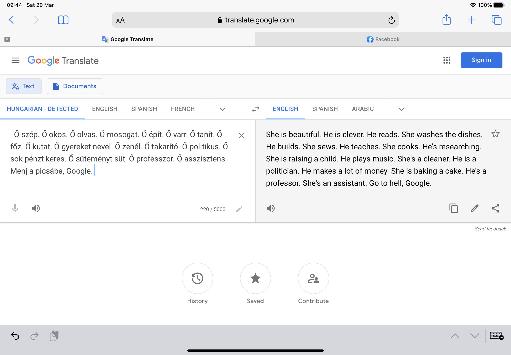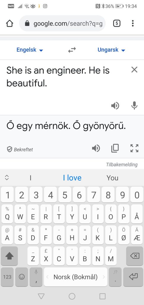 Hongaars is een genderneutrale taal, wat betekent dat de taal geen geslachtsgebonden voornaamwoorden heeft. Maar wat gebeurt er als je de Hongaarse taal door Google Translate haalt naar het Engels? Dan vult de taalmachine automatisch het geslacht voor jou in. Als het aan Dora ligt, is hier sprake van seksisme. Want ‘zij’ maakt schoon en ‘hij’ is een politicus? Erg opmerkelijk.