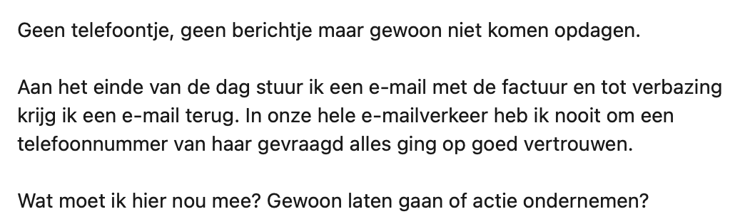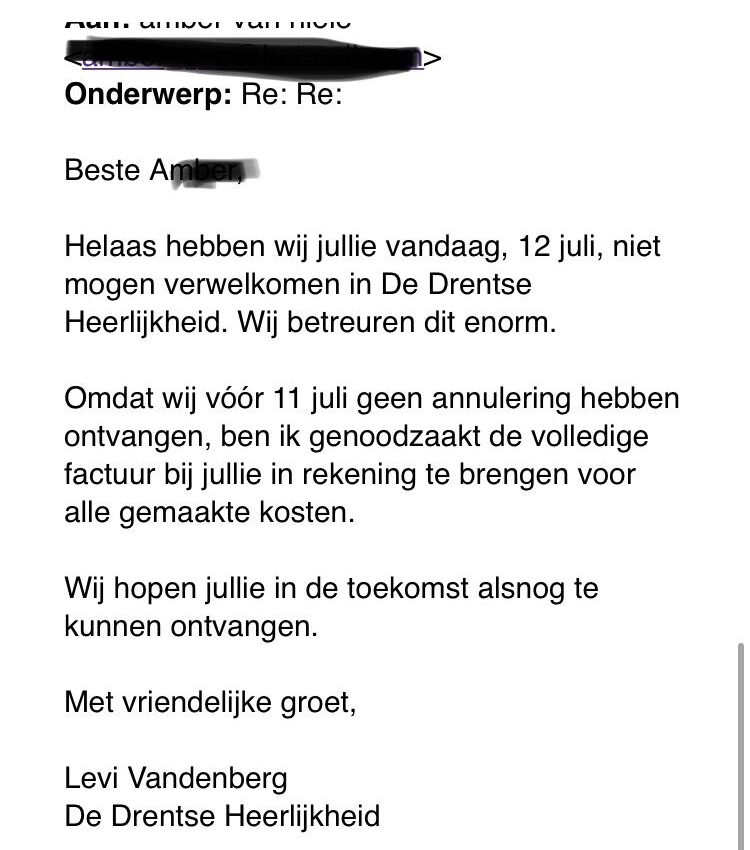 4. Levi besluit een mail te sturen met het verzoek of de groep alsnog alle kosten kunnen dekken. Alles stond immers al klaar en er was niet afgezegd.