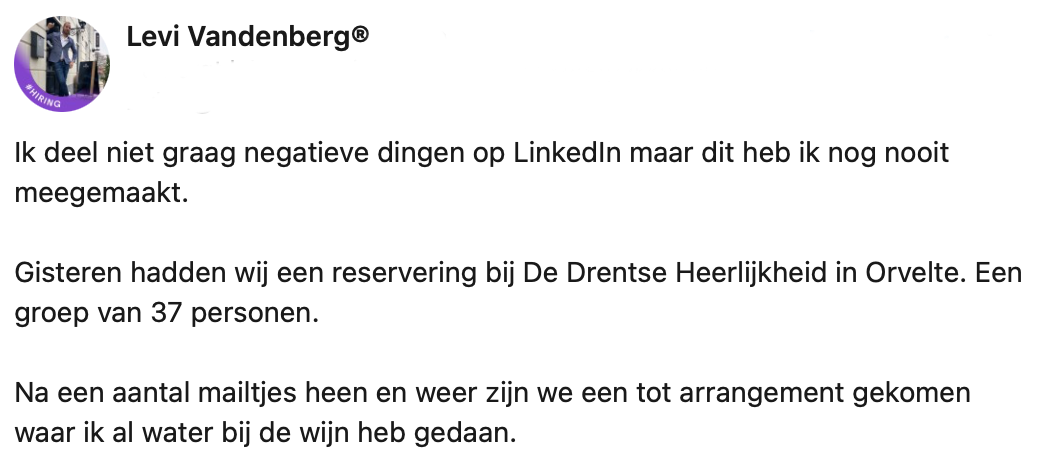 Horeca-ondernemers hebben het de afgelopen jaren niet makkelijk gehad. Ze moesten regelmatig hun deuren sluiten, maar gelukkig genieten mensen nu weer volop van goed eten en heel wat glaasjes op het terras. Restaurant eigenaar Levi deelt op LinkedIn een frustrerend verhaal. Je zou denken dat mensen de horeca, na zo’n vervelende periode, extra willen steunen: de klanten in zijn verhaal hadden echter andere plannen…