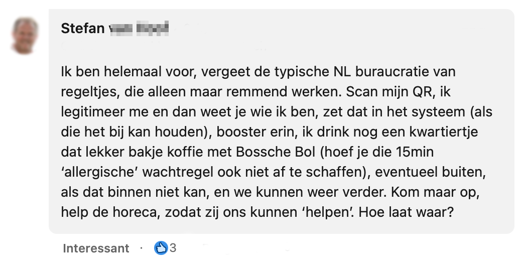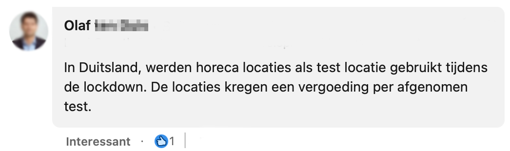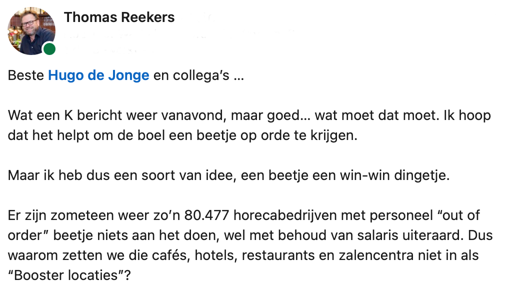 Thomas Reekers is horeca-ondernemer en moest net zoals veel andere winkels en cafés zijn deuren weer sluiten. Op LinkedIn doet hij een oproep aan Hugo de Jonge en zijn collega’s. Hij is van mening dat hij een ‘win-win’- concept heeft bedacht. Waarom maken we van horecagelegenheden geen boosterprik-locaties?