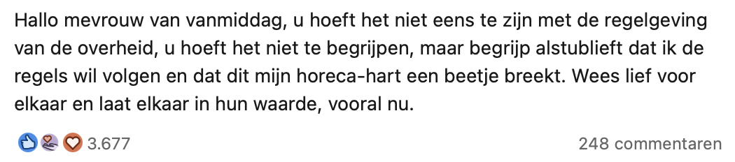 Eén van de coronamaatregelen is dat horecazaken bij binnenkomst de QR-code moeten scannen van hun klanten. Je klanten wegsturen vanwege een ontbrekende QR-code, omdat je anders een flinke boete krijgt, is voor niemand leuk. Het blijft een een lastig verhaal. Ook Tessa worstelt met deze regeling en deelt haar verhaal op LinkedIn.