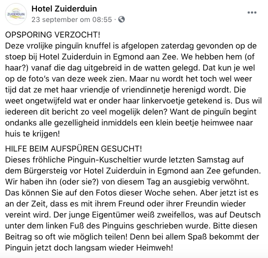 Je zou je knuffel maar kwijtraken en ‘m vervolgens terugvinden op Facebook. En hóe. Want toen Hotel Zuiderduin in Egmond aan Zee een pinquïnknuffel op de stoep van het hotel vond, besloten de medewerkers het arme beest even flink in de watten te leggen. Én om dat vast te leggen op beeld. Dat resulteerde in een fijne Facebookpost. En als we de foto’s moeten geloven, wil het knuffelbeest hoogstwaarschijnlijk alles behalve terug naar huis. Leuke marketing kunnen we het wel noemen.