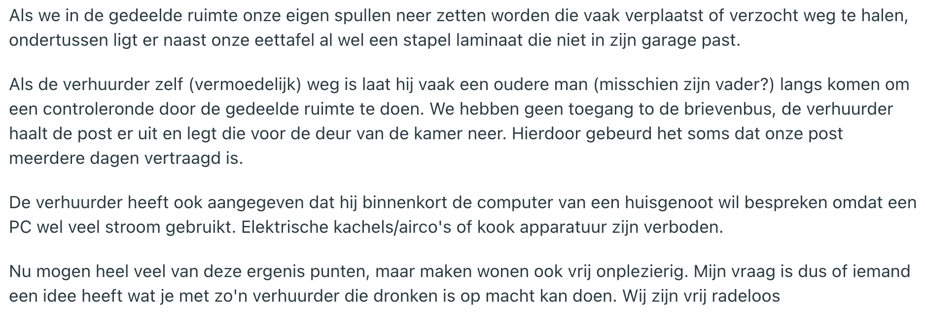 Wonen in een studentenhuis kan hartstikke leuk zijn, maar het gaat er ook weleens anders aan toe. Er is altijd wel een huisgenoot die de wc-bril gebruikt als canvasdoek voor zijn urine tekeningen of van zijn kamer een lokale vuilnisbelt maakt. Maar niet alleen de bewoners zelf zijn soms om achter het behang te plakken, ook de huisbaas kan er wat van. Deze Reddit-gebruiker krijgt bizarre briefjes van de huisbaas, met regels waar je niet bepaald warm van wordt.