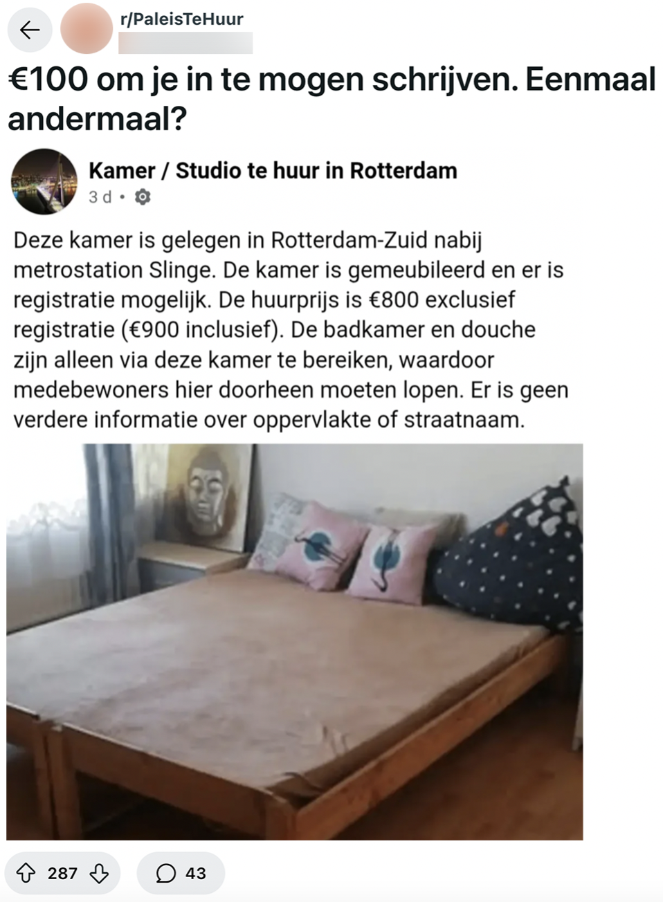 Wie op zoek is naar een nieuwe huurwoning, brengt waarschijnlijk uren door op Facebook. Het merendeel van de advertenties is waardeloos, maar af en toe duikt er toch een echte parel op. Daarom blijf je elke dag weer door de Facebook-groepen scrollen, hopend dat je iets goeds vindt. Zo ook deze woningzoekende, die op een huuradvertentie met een erg opmerkelijk detail stuit.