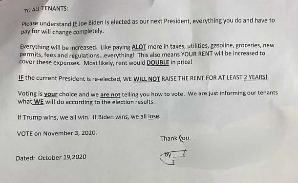 1. In de staat Colorado schreef een huurbaas dit briefje aan de mensen die wonen op zijn trailer park. Er staat dat onder andere de huur verdubbeld zal worden zodra democraat Biden de verkiezingen wint.