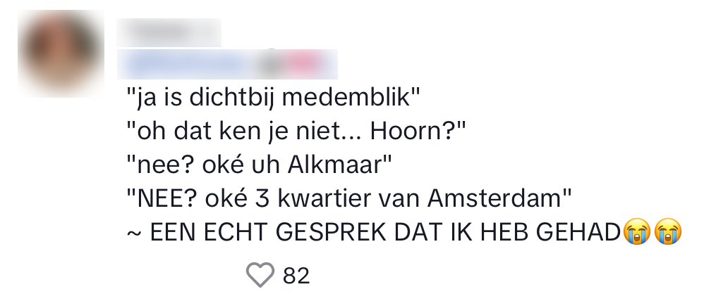 De topografie van veel Nederlanders is misschien niet best, maar als je één van de grotere steden uit ons land opnoemt, weten de meeste die nog wel te vinden. Woon je in een dorp als Lutjebroek of Emmer-Compascuum, dan wordt het veel mensen te moeilijk. Toch moet er soms antwoord gegeven worden op die ene verschrikkelijke vraag: waar kom je vandaan? Daimy heeft een slimme reactie op deze vraag bedacht en ze blijkt niet de enige te zijn die deze regelmatig toepast.