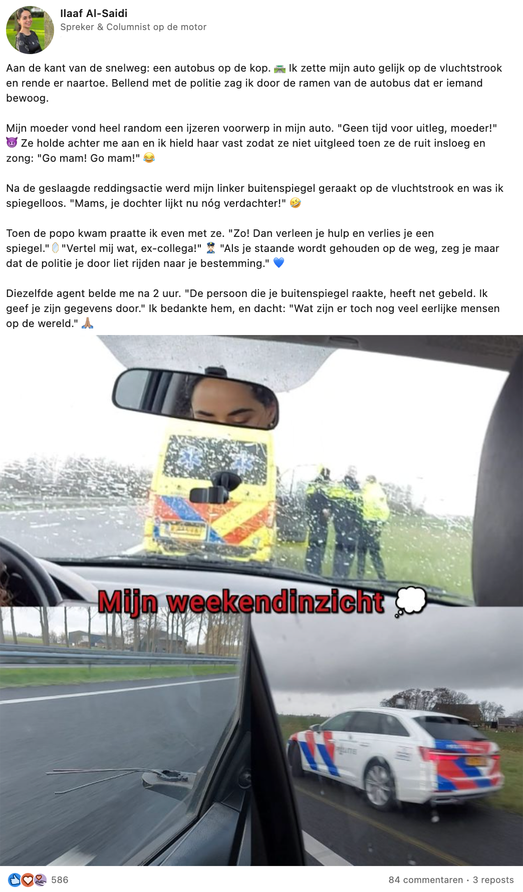 2. Ook ex-politieagente Ilaaf verdient een shoutout. Toen zij een autobus op de kop langs de weg zag staan, twijfelde ze geen seconde en schoot ze te hulp.