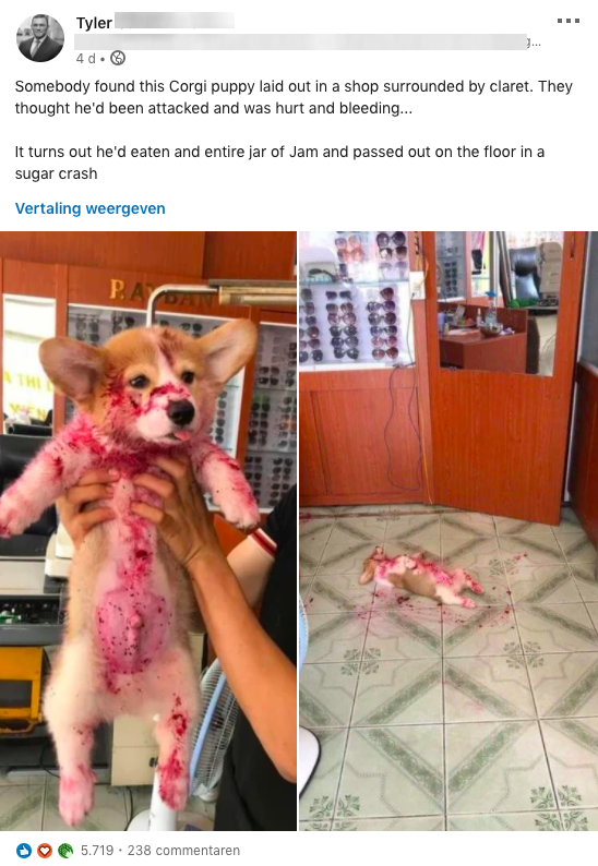 5. Wat blijkt? De puppy ging zich te buiten aan een pot jam. Alle paniek voor niks.
