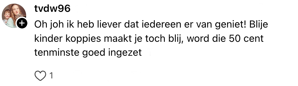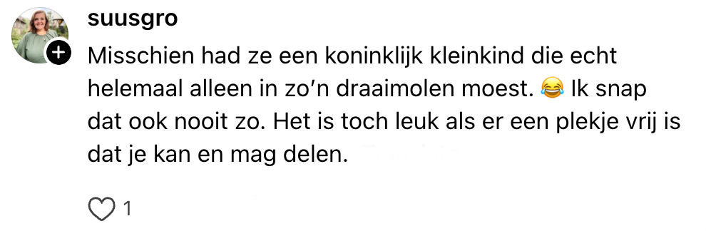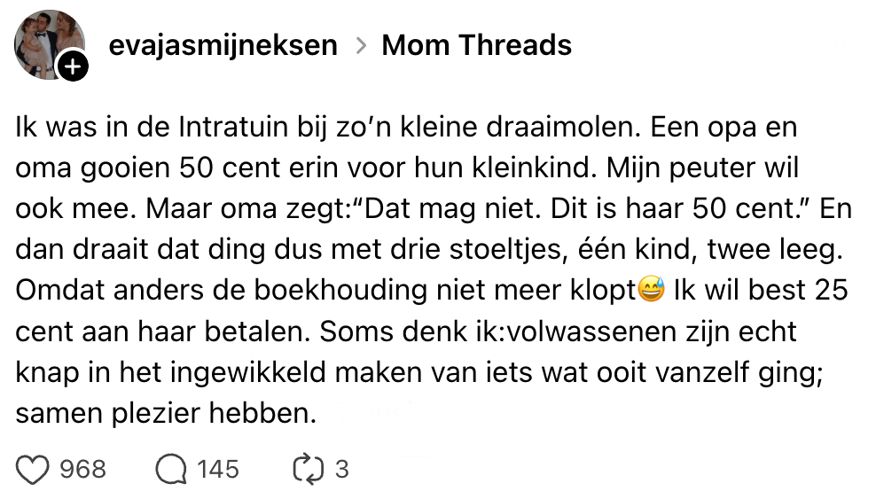 Voor kinderen is het meestal geen feest om mee te gaan winkelen. Eindeloos je ouders volgen, niet eens bij het speelgoed mogen kijken en dan een heel kwartier de longen uit je lijf schreeuwen omdat je je zin niet krijgt. Het minste wat ouders dan kunnen doen, is er het beste van maken. Daarom wil Eva haar peuter in de draaimolen bij Intratuin zetten. Maar voordat ze dat kan doen, wordt ze tegengehouden door de grootouders van een ander kind. Ze vindt de reden nogal gierig, en andere Nederlanders hebben er ook wat over te zeggen.