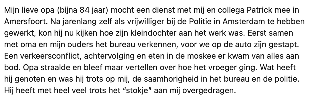 1. De opa van Iris is vroeger vrijwilliger geweest bij de politie Amsterdam en mag nu (met hoge uitzondering) nog één dienst meedraaien met zijn kleindochter.