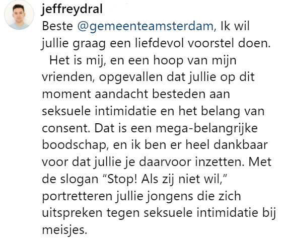 Het programma tegen Seksuele Intimidatie en Seksueel geweld van gemeente Amsterdam probeert seksuele intimidatie en geweld tegen te gaan met verschillende campagnes. Hier zit ook een opvallende straatcampagne tussen, maar hierbij is er alleen focus op meisjes en jonge vrouwen, iets waar Jeffrey verandering in wil zien en daarom met de bestaande campagne aan de haal gaat.