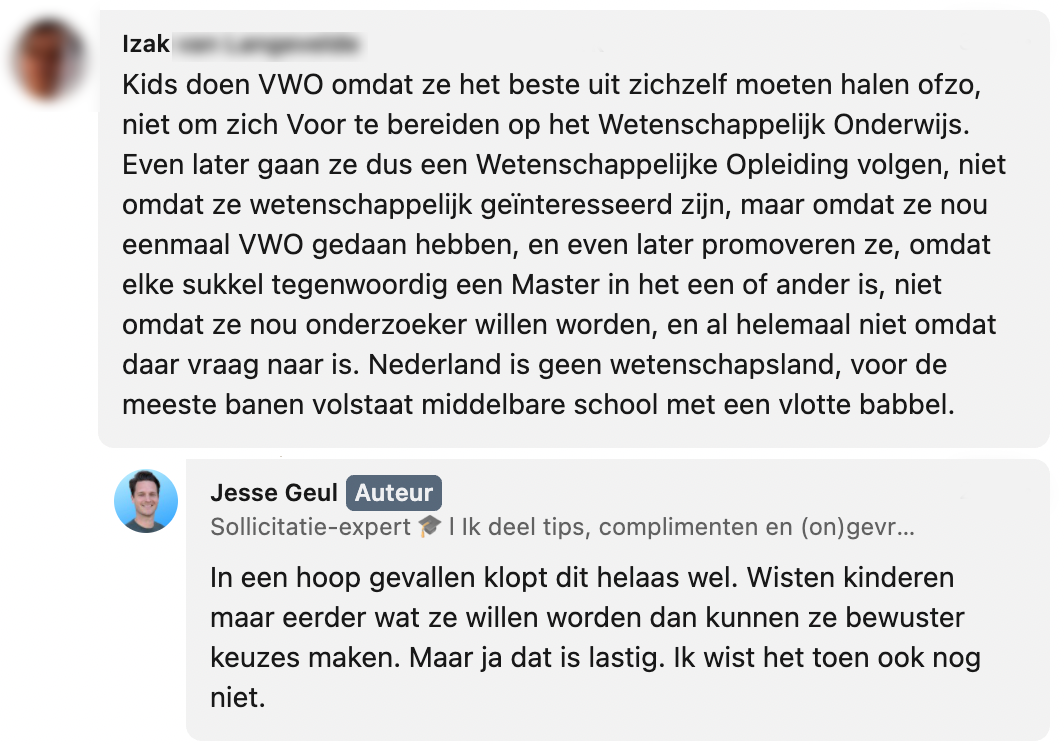 Altijd overal het meeste uithalen: het is de boodschap die veel mensen op jonge leeftijd meekrijgen. Thuis, op school en zelfs bij de sportclub. Maar, is hoger altijd beter? sollicitatie expert Jesse Geul heeft er een duidelijke mening over. Hij deelt de dagen waarin veel scholieren hun examenuitslag krijgen een belangrijke boodschap, waar veel mensen zich in kunnen vinden.