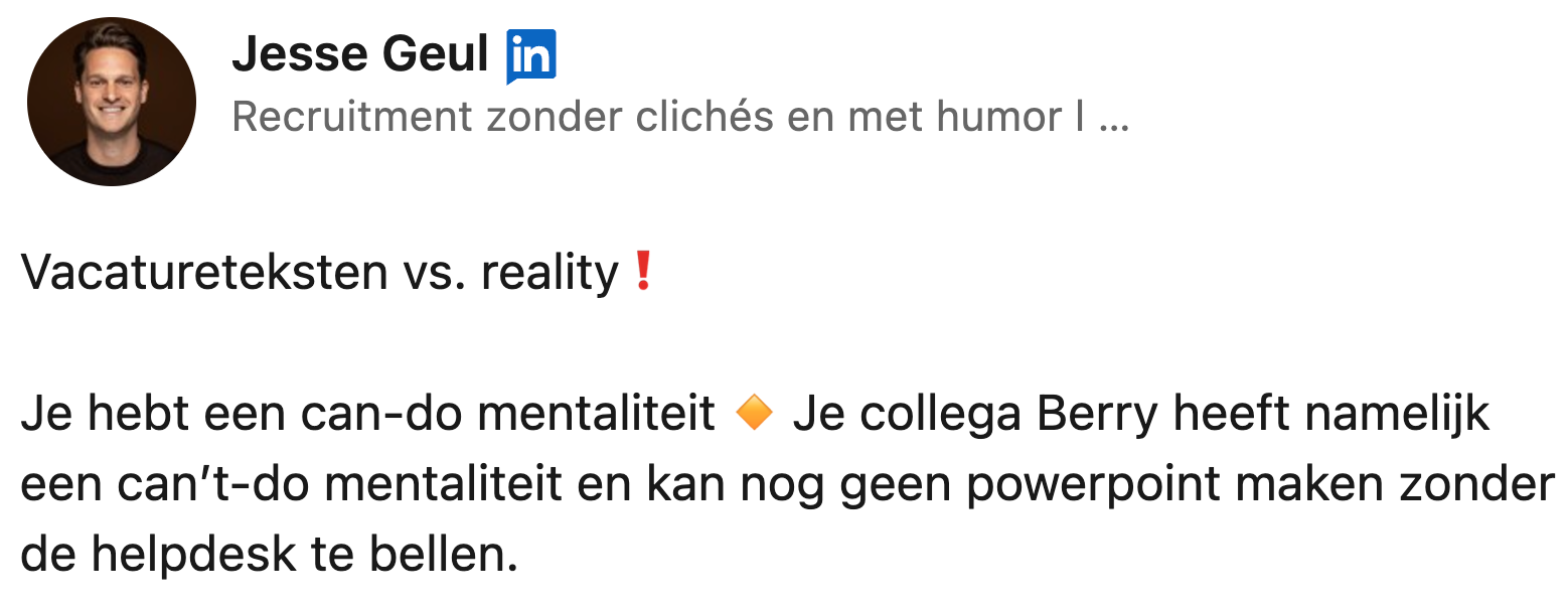 1. Jesse maakt er flink wat werk van en weet de vacatures perfect te vertalen.