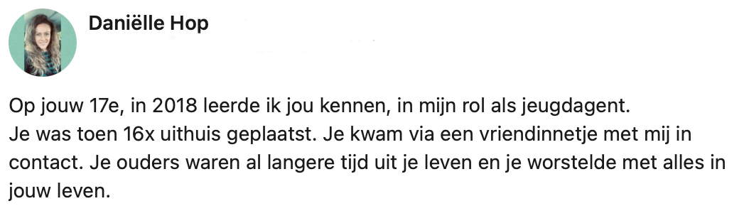 Als je bij de politie werkt, kom je met veel verschillende mensen in aanraking. Daniëlle werkte als jeugdagent toen ze Kai ontmoette, die al meerdere keren uit huis was geplaatst. Ze hadden veel contact met elkaar en daardoor ontstond een bijzondere band.