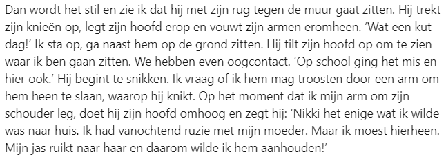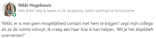Na jarenlange ervaring in de jeugdzorg, helpt Nikki nu om deze zorg te optimaliseren. Nikki coacht vanuit haar eigen bedrijf &NIK teams en jeugdzorgprofessionals binnen de jeugdzorg omwille van het optimaliseren van de samenwerking, zodat zij de meest veilige en stabiele basis kunnen vormen voor hun doelgroep. Tijdens haar werk wordt ze om hulp gevraagd door een collega, waarna ze in aanraking komt met een onbegrepen gefrustreerde jongen. Ze deelt het aangrijpende verhaal op LinkedIn.