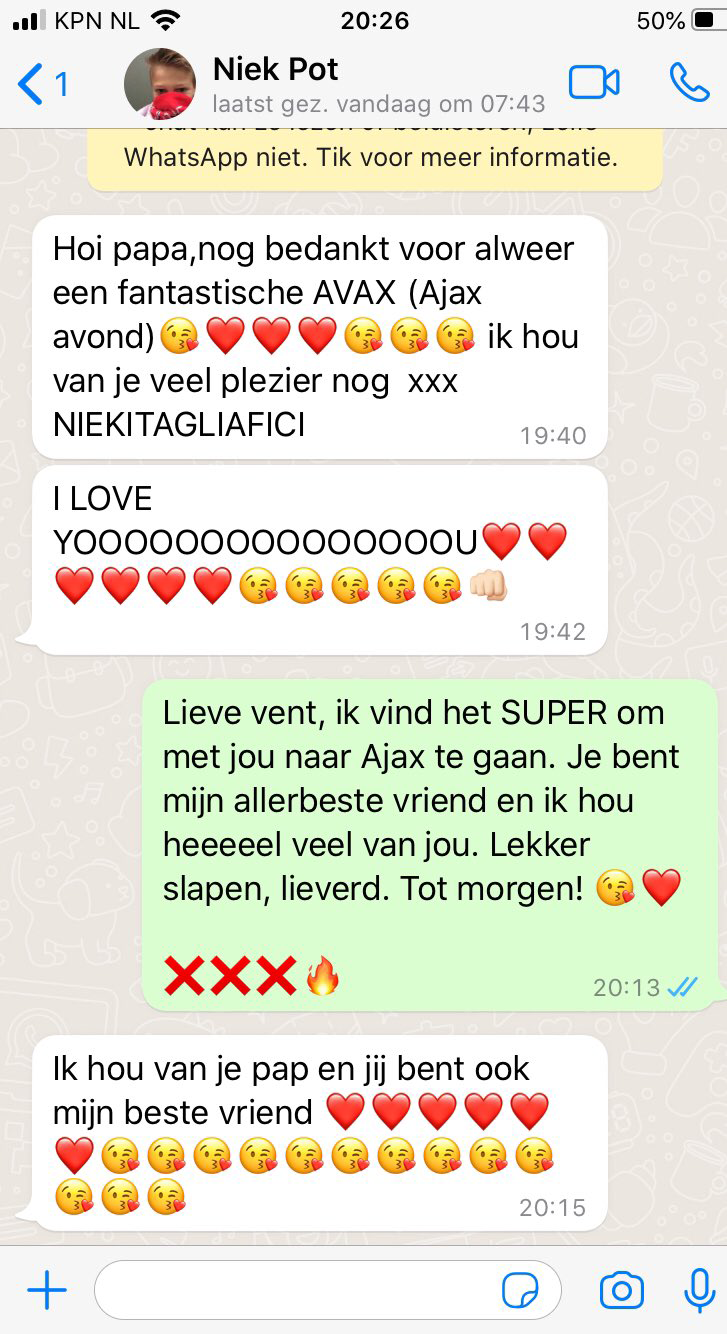 Menno nam zijn zoon Niek afgelopen week mee naar Ajax – Borussia Dortmund. Niek heeft enorm genoten van de wedstrijd en zijn liefde voor Ajax is alleen nog maar meer gegroeid. Om zijn vader te bedanken voor de wedstrijd stuurde hij hem een hartverwarmend appje. Zijn vader deelt een screenshot van het mooie bericht op Twitter.
