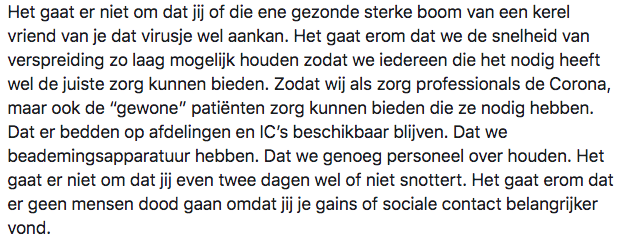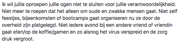 2. En daarmee doet ze een oproep: blijf binnen en ga niet alsnog dingen ondernemen of zelf dingen organiseren omdat de overheid alles heeft platgelegd.