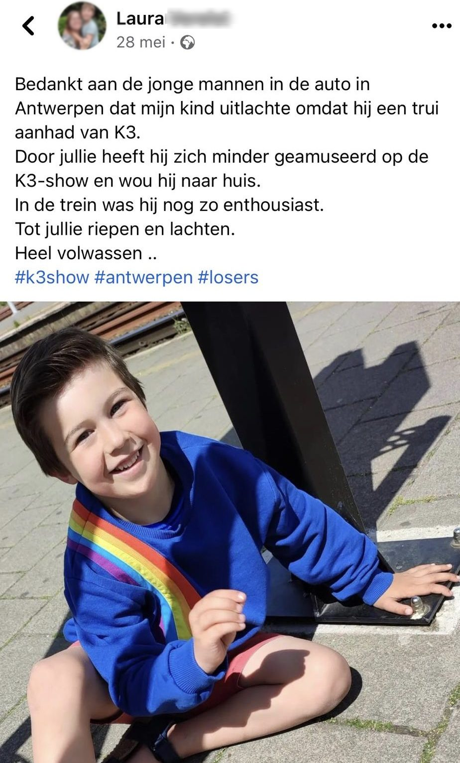 Anno 2022 zouden we toch denken dat we iedereen in zijn waarde laten, maar uit de volgende situatie blijkt het tegendeel. Laura was namelijk samen met haar zoontje van zes onderweg naar een K3-optreden, toen er een stel mannen vanuit de auto de outfit van Laura’s zoon bekritiseerden. Die mannen waren het vijf minuten later misschien alweer vergeten, maar het zorgde helaas voor grote impact bij Laura’s zoontje…