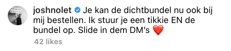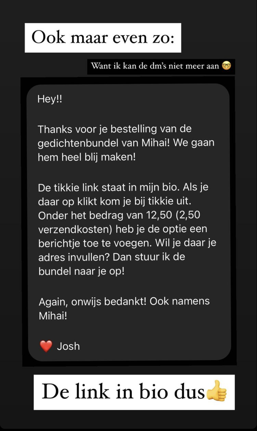 Joshua Nolet, zanger en rapper bij Chef’Special en kandidaat (of Mol?) bij het nieuwe seizoen van Wie is de Mol?, deelde onlangs een bericht over zijn favoriete straatverkoper Mihai. Wat hij dan verkoopt? Hij maakt dichtbundels in het Roemeens en Nederlands. Volgens Joshua zullen de gedichten van Mihai je absoluut raken. Joshua roept dan ook op om eens bij de man langs te gaan en een bundel te kopen. En die oproep loopt lekker uit de hand.