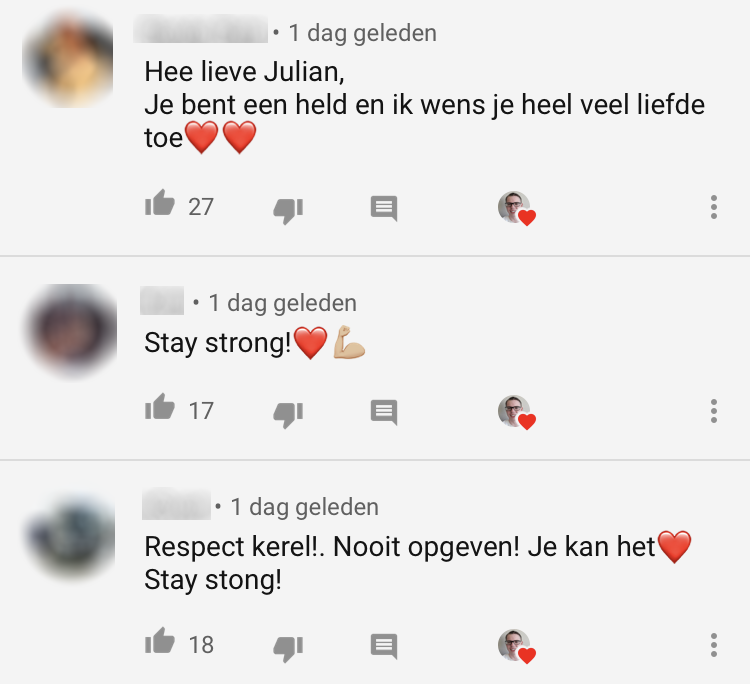 6. Julian is ondanks z’n ziekte enorm positief en sterk. Z’n video’s zijn confronterend maar geven ook een eerlijk kijkje in het leven van iemand met kanker.