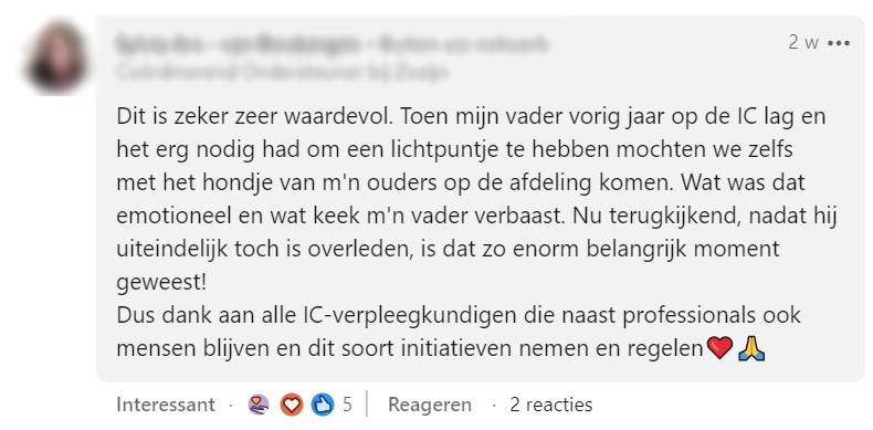 Op de intensive care liggen, kan een traumatische ervaring zijn. Juliëtte weet daar alles van. Als IC-verpleegkundige ziet zij dag in dag uit hoe zwaar haar patiënten het hebben. Daarom probeert ze – hoe druk ze het ook heeft – altijd voor lichtpuntjes te zorgen voor haar patiënten. Op LinkedIn deelt ze een voorbeeld van zo’n lichtpuntje. Dat heerlijke verhaal gaat helemaal viral. En wij snappen wel waarom.