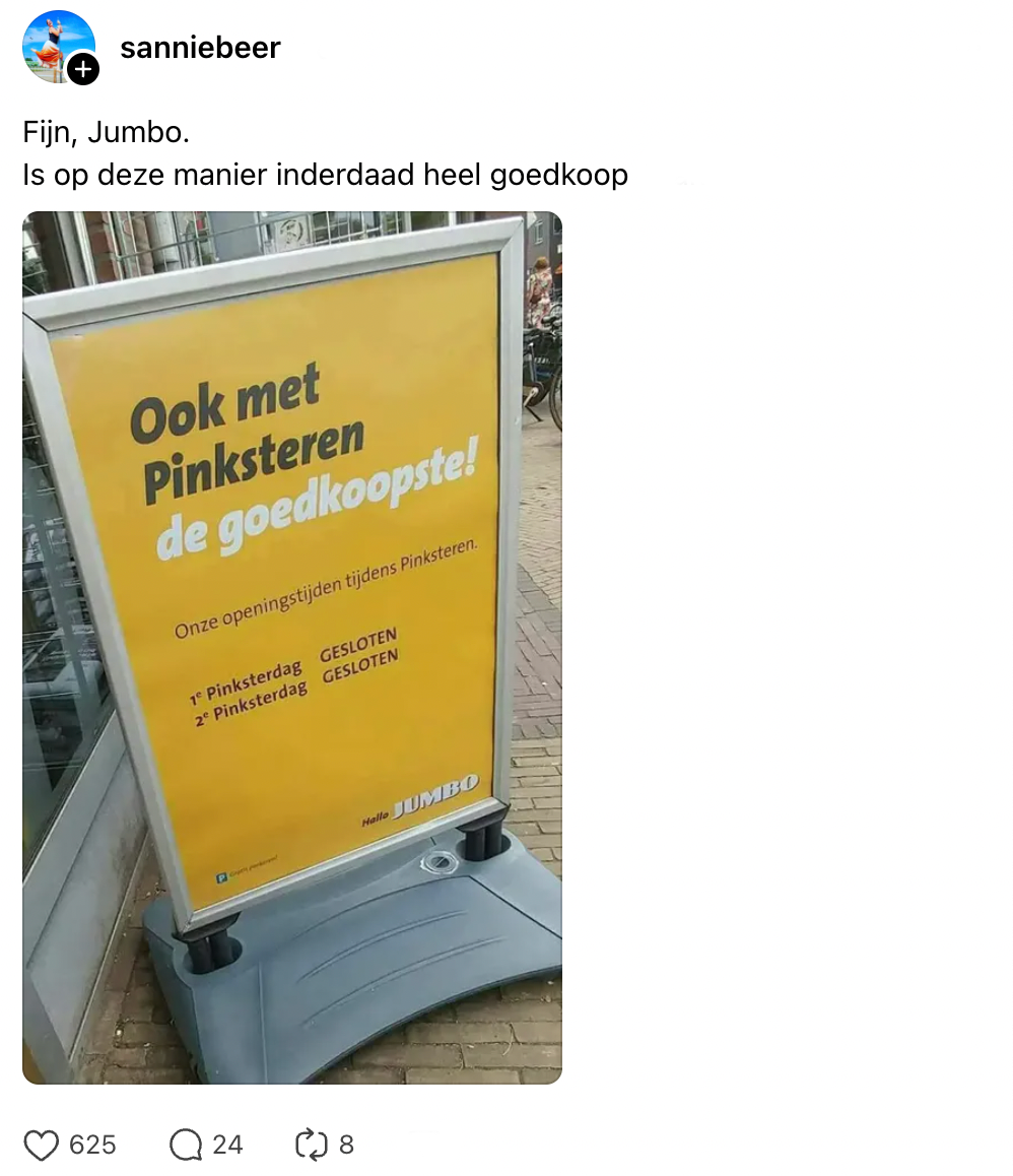 Pinksteren is weer achter de rug. Een feest dat voor sommigen een belangrijke betekenis heeft, terwijl het voor anderen vooral een extra vrije dag betekent. Veel kledingwinkels dicht, veel meubelzaken dicht en veel supermarkten dicht. De winkels die gisteren wél open waren, pronkten daar dan ook uitgebreid mee. Een Jumbo-filiaal wilde op een bord voor de ingang laten weten óók tijdens Pinksteren de goedkoopste te zijn, maar zag een klein detail over het hoofd.