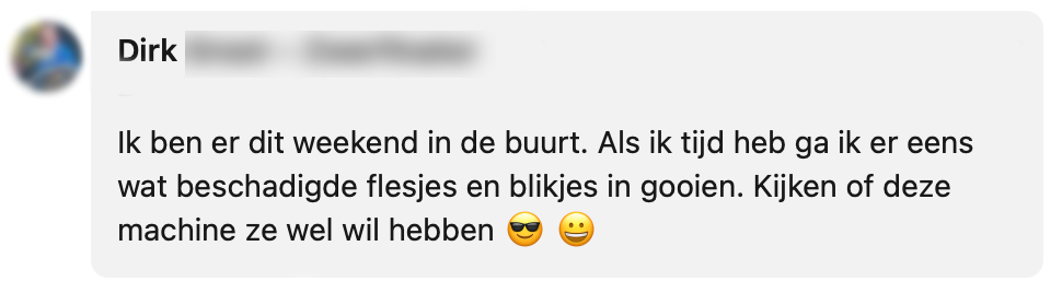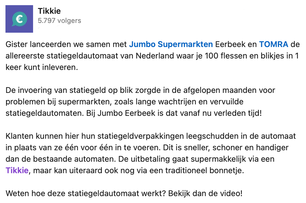 5. Leuk dat klanten in Eerbeek hier nu van kunnen genieten, maar mensen willen dat deze statiegeldmachine van Tikkie en Jumbo met een bloedgang ook bij hen in het dorp wordt geplaatst.
