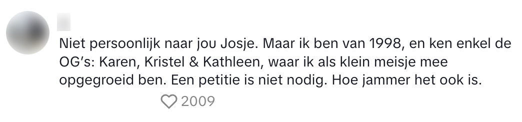 Nederland en Vlaanderen zijn volledig in de ban van de reünie der reünies: die van de originele K3. Karen, Kristel en Kathleen komen oktober dit jaar en april volgend jaar samen voor optredens waarin ze hun oude bangers zingen. Fans verloren gisteren massaal hun hart (en hun geld) tijdens de ticketverkoop. Sommige mensen zijn echter niet opgegroeid met Kathleen, maar met Josje als blond lid van de groep. Zij vragen zich af of het Nederlandse K’tje ook tijdens de reünie zal verschijnen, en zij geeft op social media opheldering.