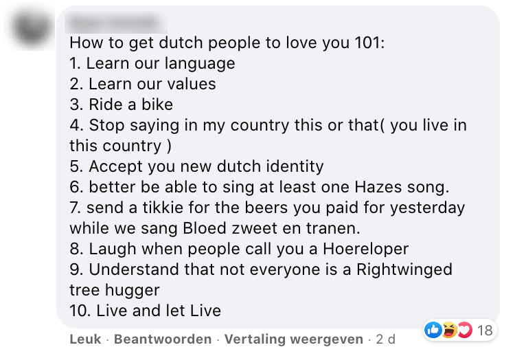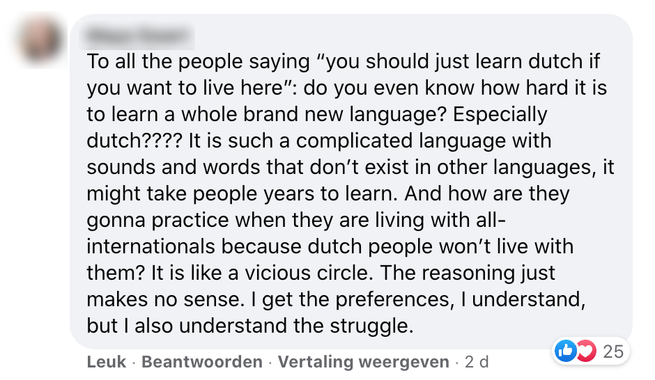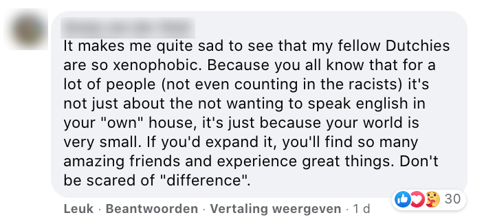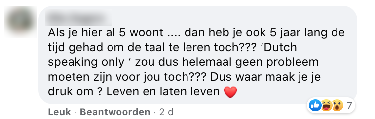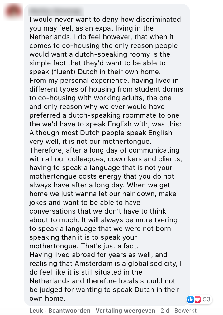 3. Er zou mee bedoeld worden dat men thuis liever Nederlands spreekt dan Engels. Dat hier een punt van gemaakt wordt, vindt deze persoon belachelijk.