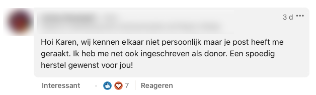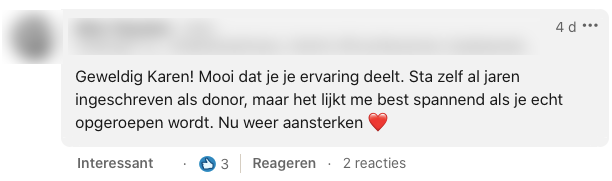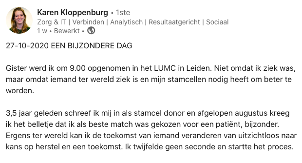 Karen is stamceldonor en ze deelt hierover een bijzonder verhaal op Linkedin, wat al gauw duizenden mensen bereikt. Ze is namelijk opgenomen voor een donatie via het bloed om haar stamcellen te doneren aan een ziek iemand. De vrouw is te zien in een ziekenhuisbed en geeft uitleg over de situatie. Karen wil mensen inspireren om ook donor te worden, en dat lukt haar zeker.