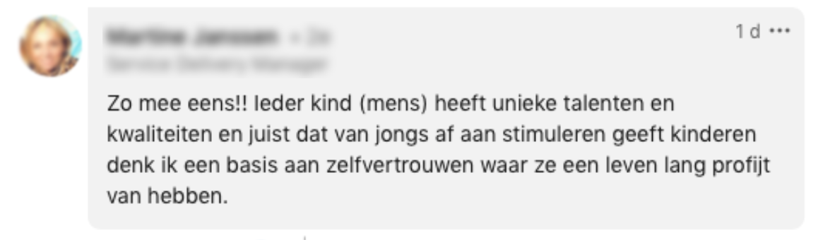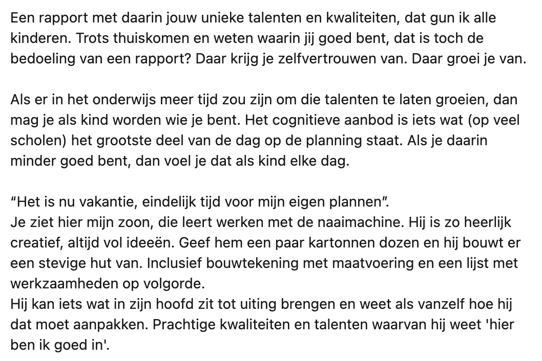 2. Ze vindt dat er in een rapport ook aandacht mag zijn voor de unieke talenten en kwaliteiten van een kind.