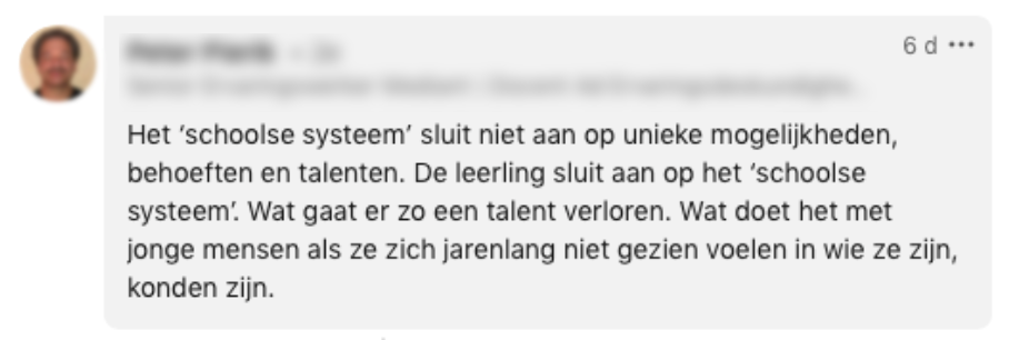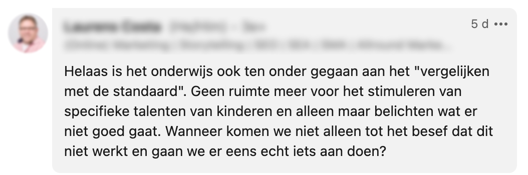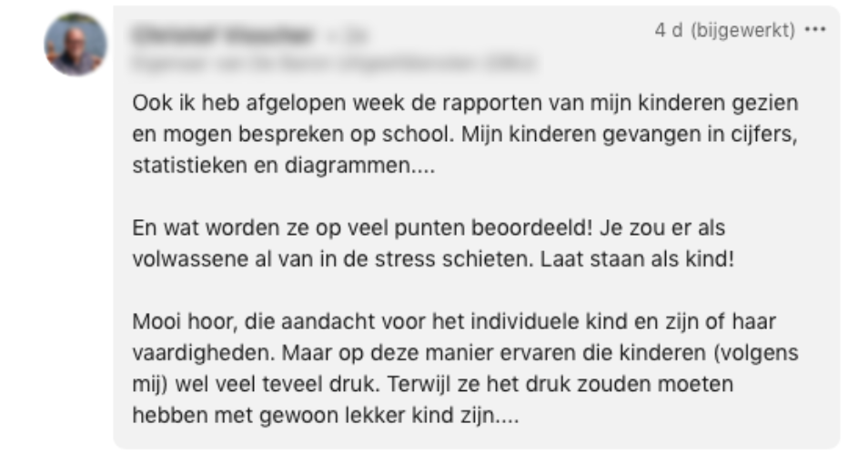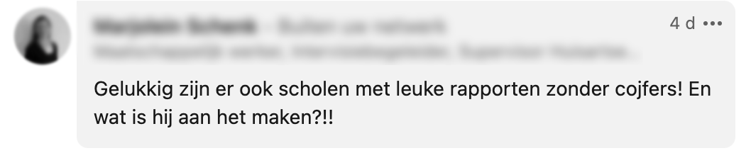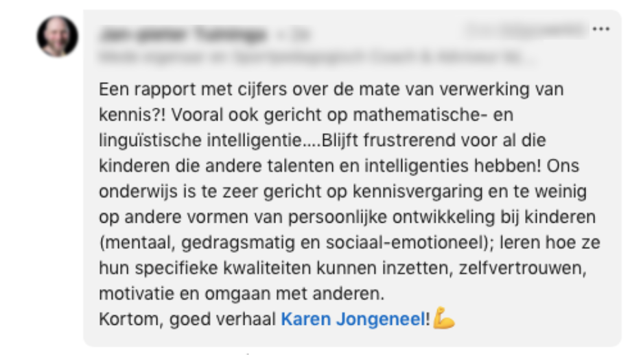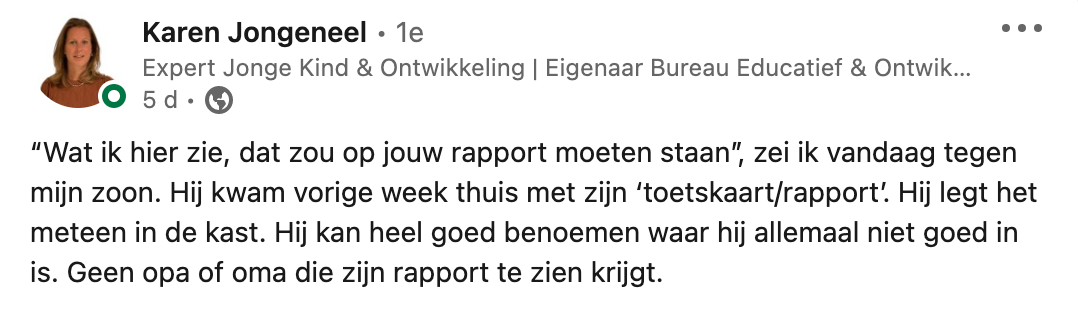 Nadat Karen’s zoon thuiskwam met zijn rapport, legde hij ‘m zo snel mogelijk in de kast. Hij was er niet trost op. Maar Karen weet dat haar zoon over veel meer talenten beschikt en daar zou het onderwijs volgens haar óók naar moeten kijken. Op LinkedIn deelde ze haar verhaal, met een oproep aan het onderwijs ook te beoordelen op unieke talenten en kwaliteiten.