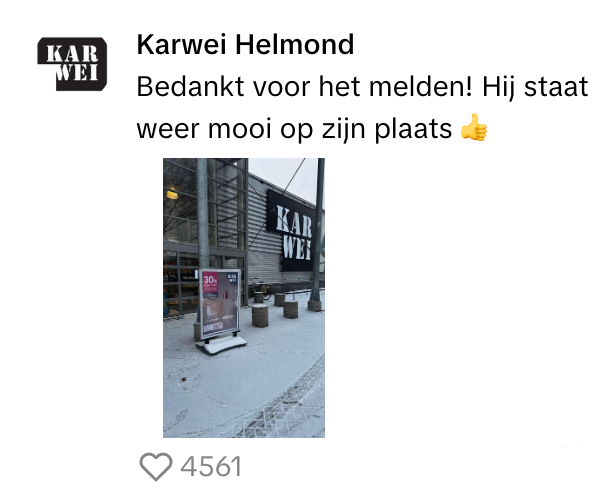 1. Karwei, zo’n bord buiten laten staan is ook absoluut niet praxis, hè?