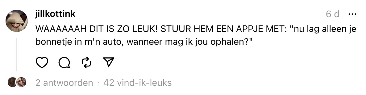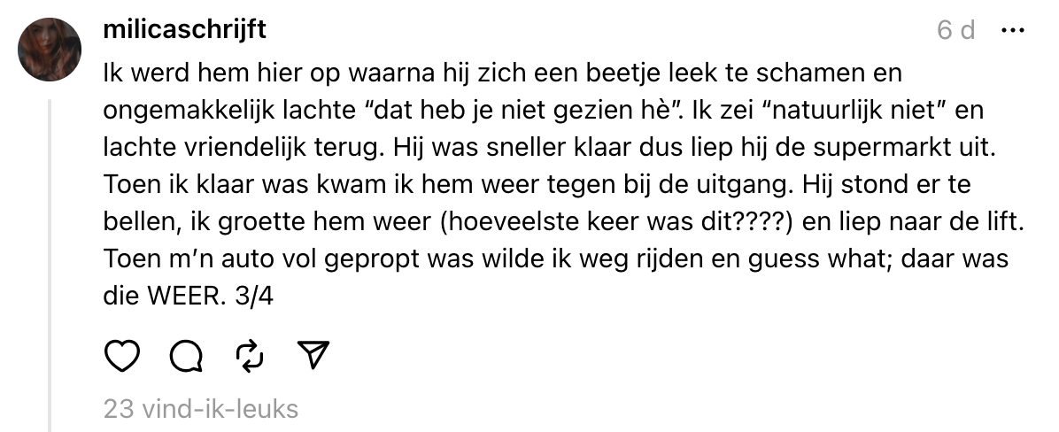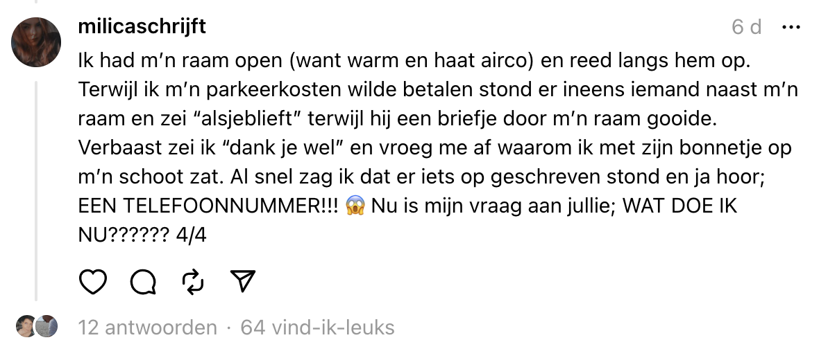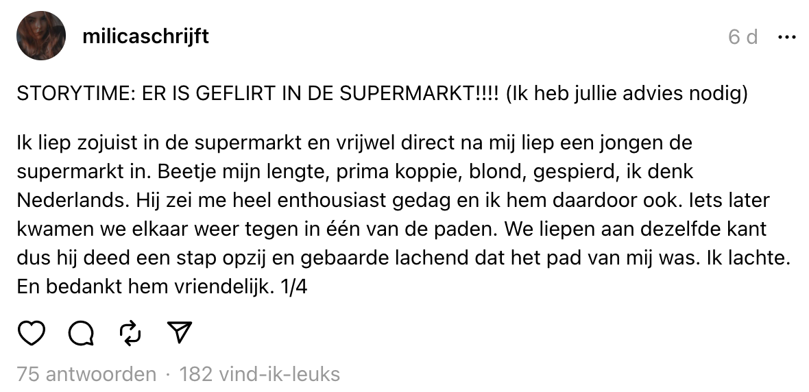 Tegenwoordig ontstaan er een hoop liefdesavontuurtjes doordat je iemand een dikke superlike hebt gegeven op Tinder of Bumble. Dat singles hier hun beste openingszinnen uit de hoge hoed toveren, weet iedereen met een beetje ervaring in online daten. Maar stel je voor dat je zo’n superlike in het openbaar spot, durf je diegene dan nog steeds met een gewaagde ijsbreker aan te spreken? Nadat Milica meerdere keren oogcontact heeft met een fraaie verschijning in de supermarkt, maakt diegene met behulp van een kassabon een move. Vervolgens vraagt ze online om een flinke dosis liefdesadvies.
