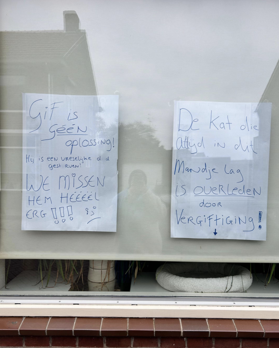 Huisdieren maken bij veel mensen deel uit van de familie. Hoewel het vreselijk irritant kan zijn als je kat weer eens een kamerplant heeft omgegooid of een muis mee naar binnen brengt, doet dat er allemaal niet meer toe als-ie aan het einde van de dag tegen je aan komt liggen op de bank. Sena loopt langs een huis waar een kat in het kozijn zit, en ziet ineens twee briefjes voor het raam hangen. De verdrietige maar belangrijke boodschap die hierop staat, raakt veel mensen diep.
