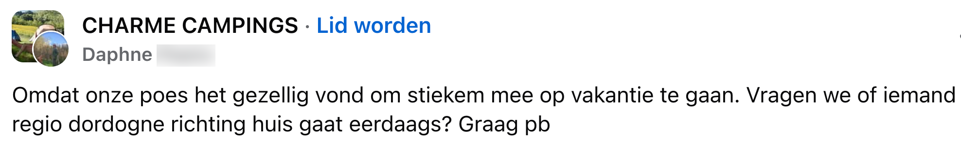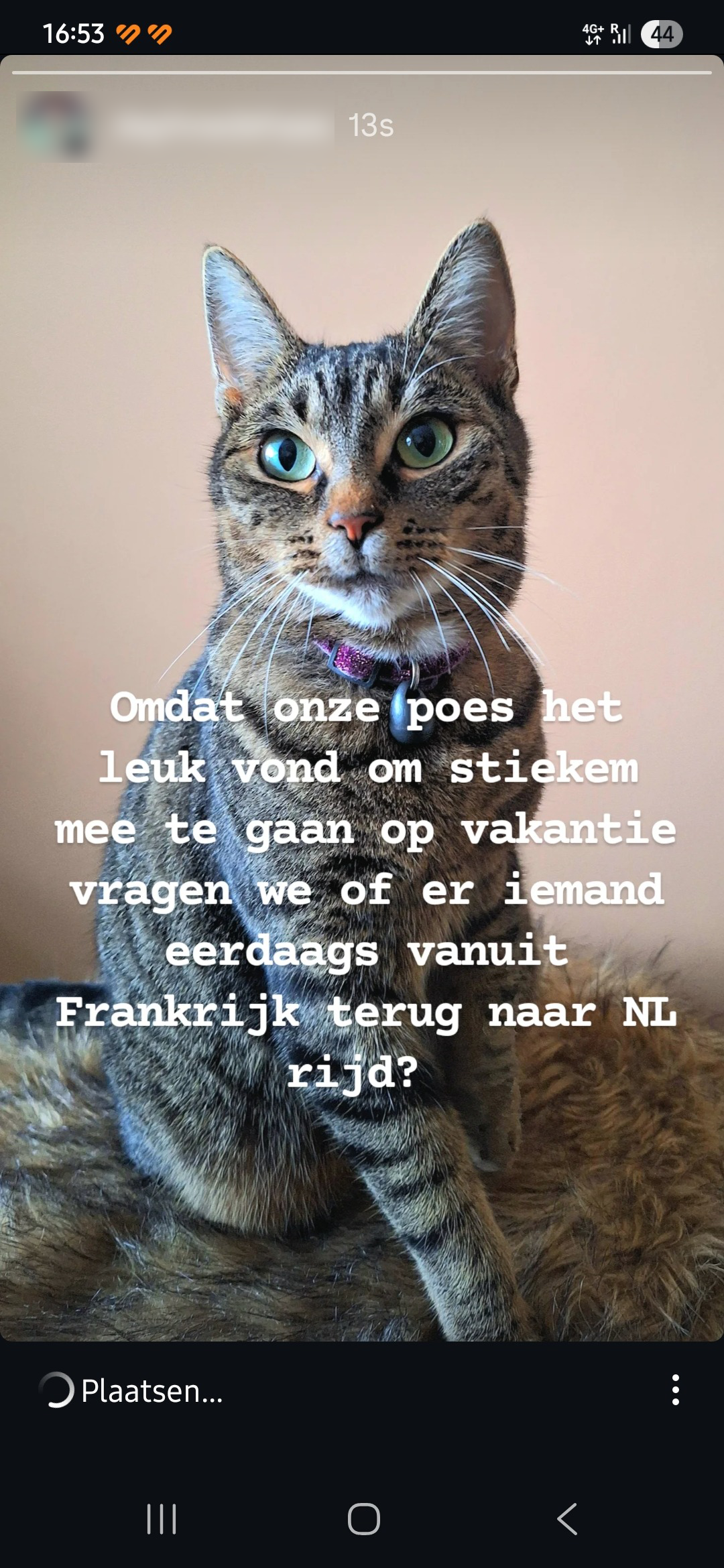 Het liefst zou je natuurlijk je huisdier altijd met je meenemen, maar op vakantie gaat dat niet altijd even makkelijk. Zo wordt je cavia er waarschijnlijk niet heel gelukkig van om acht uur lang in een vliegtuig te zitten, en accepteert de chagrijnige eigenaresse van je B&B ‘kein Haustiere’. En dus zit er niets anders op dan thuis voor een oppas of opvang te zorgen. Daphne wil ook zonder kat op vakantie gaan, maar de kat in kwestie denkt daar zelf anders over. En dus doet ze een hoopvolle oproep op Facebook.