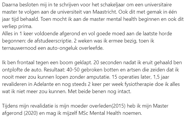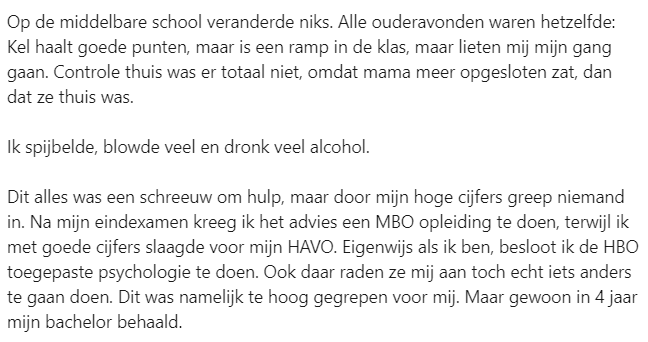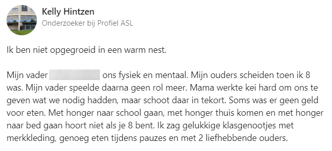 Vaak kom je niet zonder slag of stoot waar je nu bent. Voor Kelly was het helemaal lastig. Zij heeft geen fijne jeugd gehad waar ze is mishandeld en iedereen haar altijd onderschatte. Nu deelt ze haar heftige verhaal op LinkedIn en hoopt ze anderen te bereiken en inspireren.