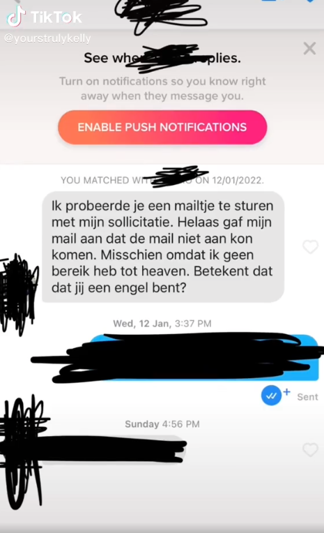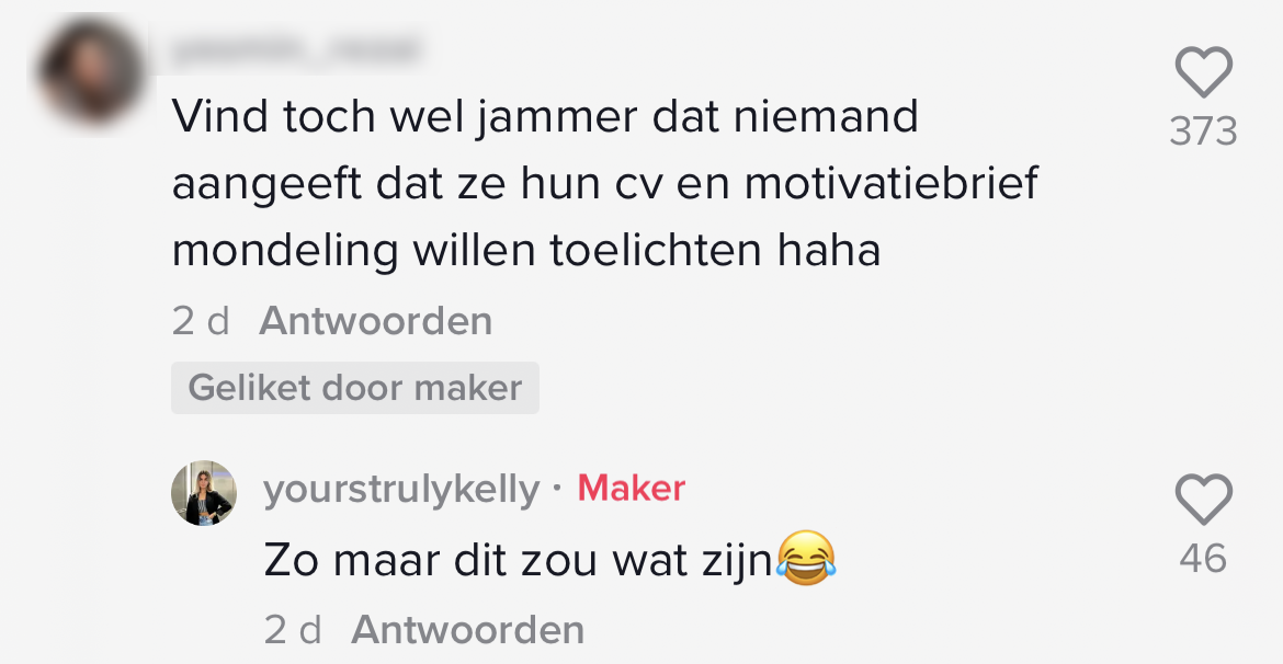 1. Kelly maakte er een video over en plaatste het op TikTok. Zoals je ziet stromen de sollicitaties binnen.