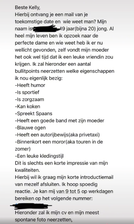 Mocht je een fanatiek Tinder-gebruiker zijn, dan heb je waarschijnlijk al heel wat (verschrikkelijke) Tinderbio’s voorbij zien komen. Maar de 19-jarige Kelly weet hoe ze het moet aanpakken. Kelly zette namelijk een ‘vacature’ in haar bio, waar mannen kunnen solliciteren voor de functie ‘boyfriend material’. Wat ze daarvoor moeten doen? Een Tinder CV en ‘match motivatiebrief’ mailen, en afwachten maar. Denk je nu: ”wie gaat dat nou doen?”. Nou, kijk maar even mee.